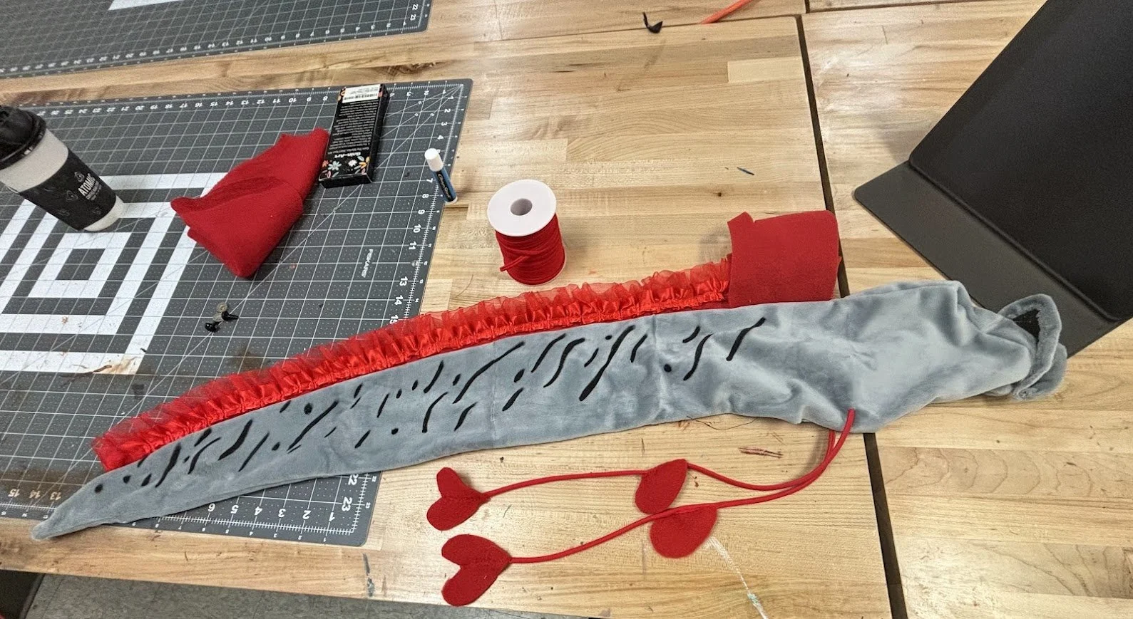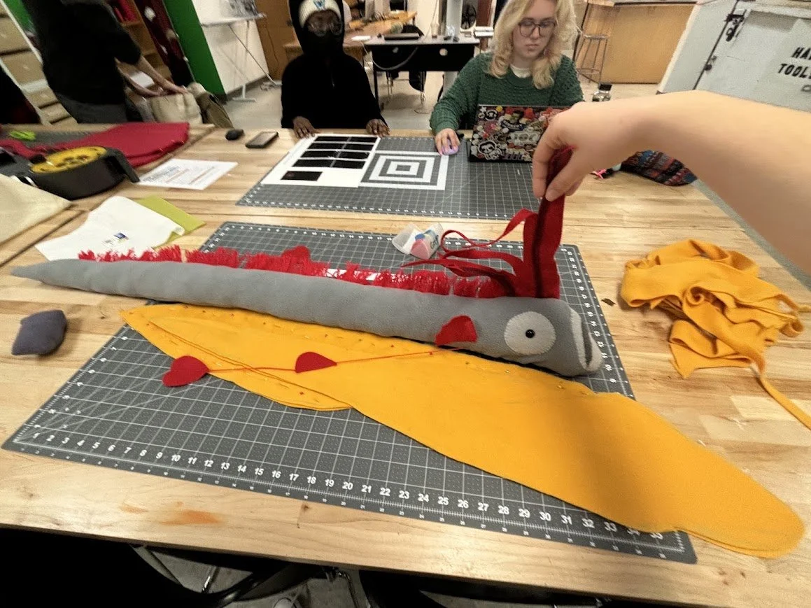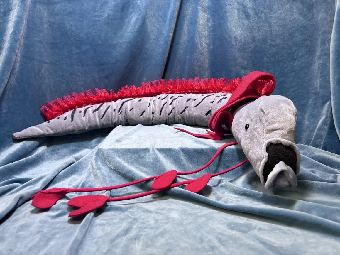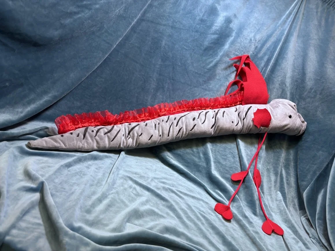 This oarfish plush is 3 feet long and features a ruffled ribbon fin down it's back, and a hand drawn pattern with fabric ink on it's sides. It’s pectoral fins hang from the front of the fish with an elastic string and fabric details.
