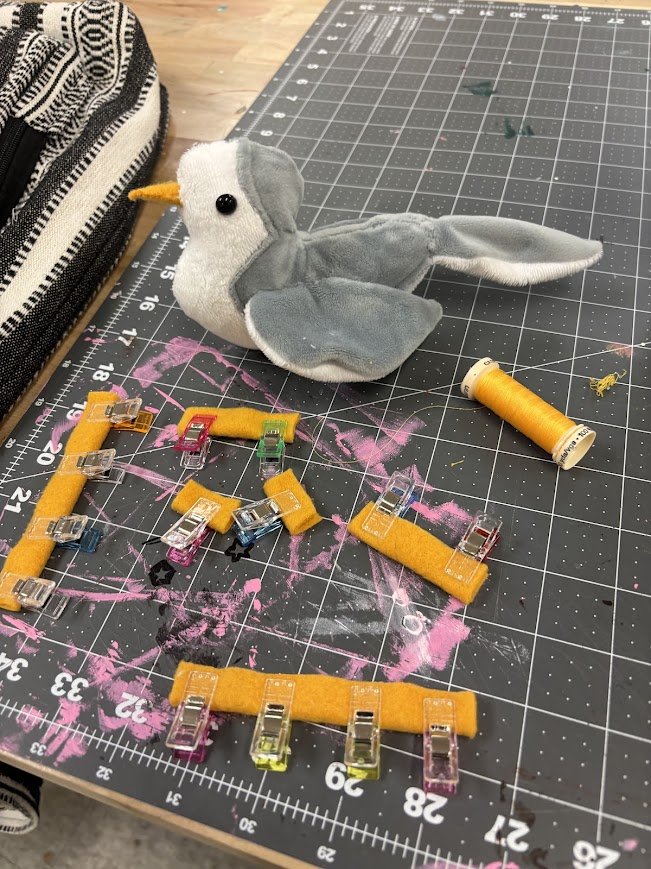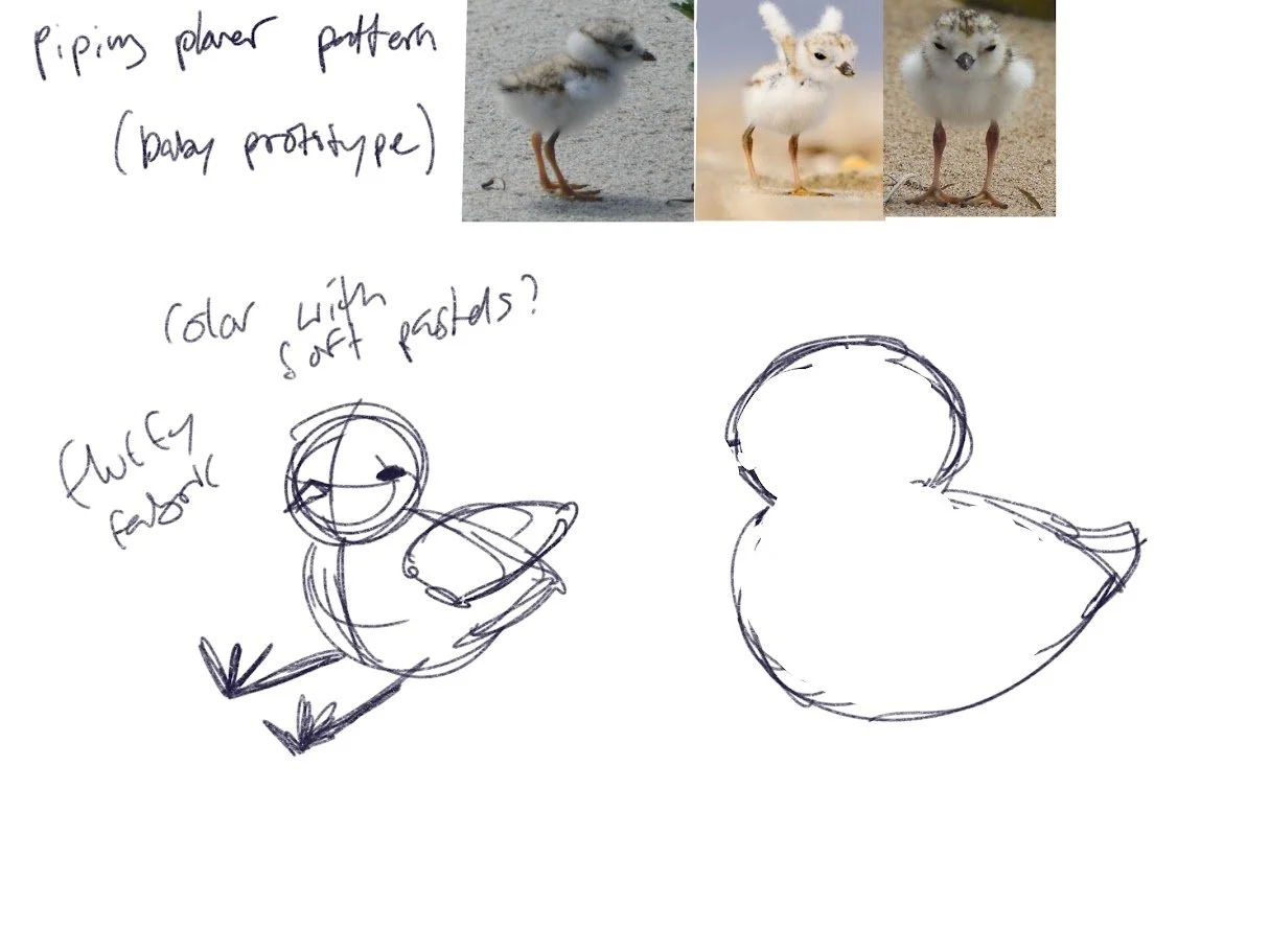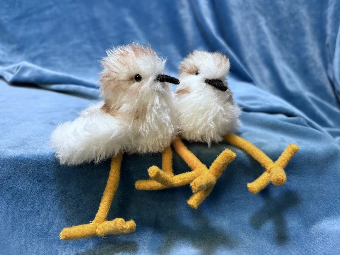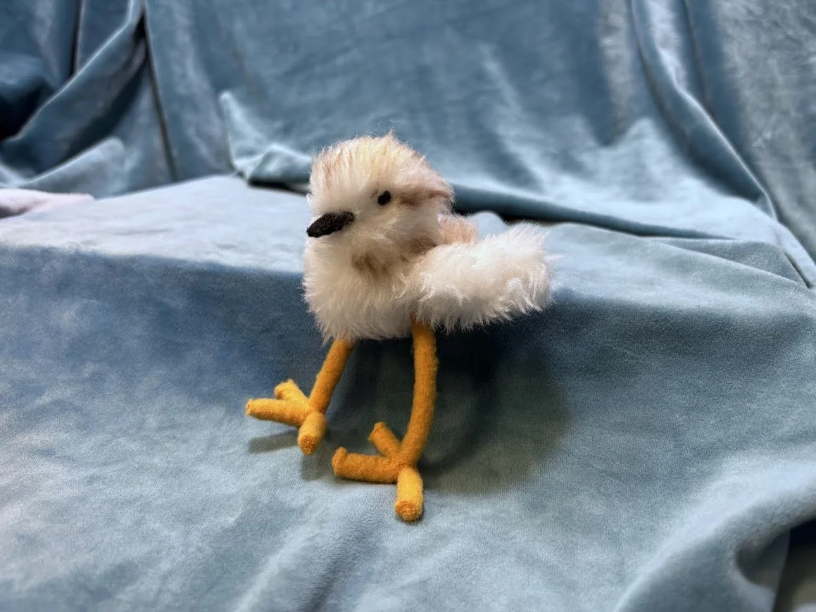 The Plover Chick is made with a fluffy faux fur fabric that is colored with alcohol inks to dye the fabric the muted grey and browns of their baby feathers. their beak is all black, as it turns orange when they mature.