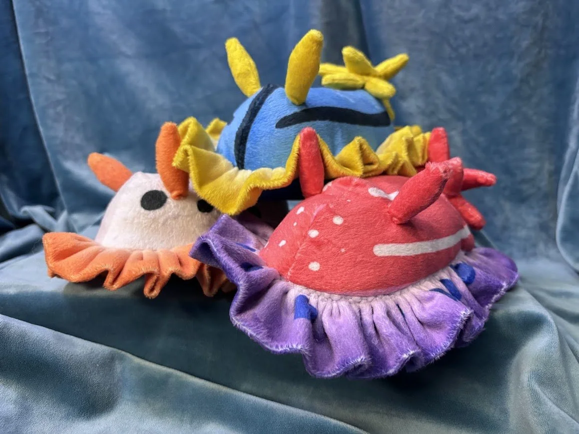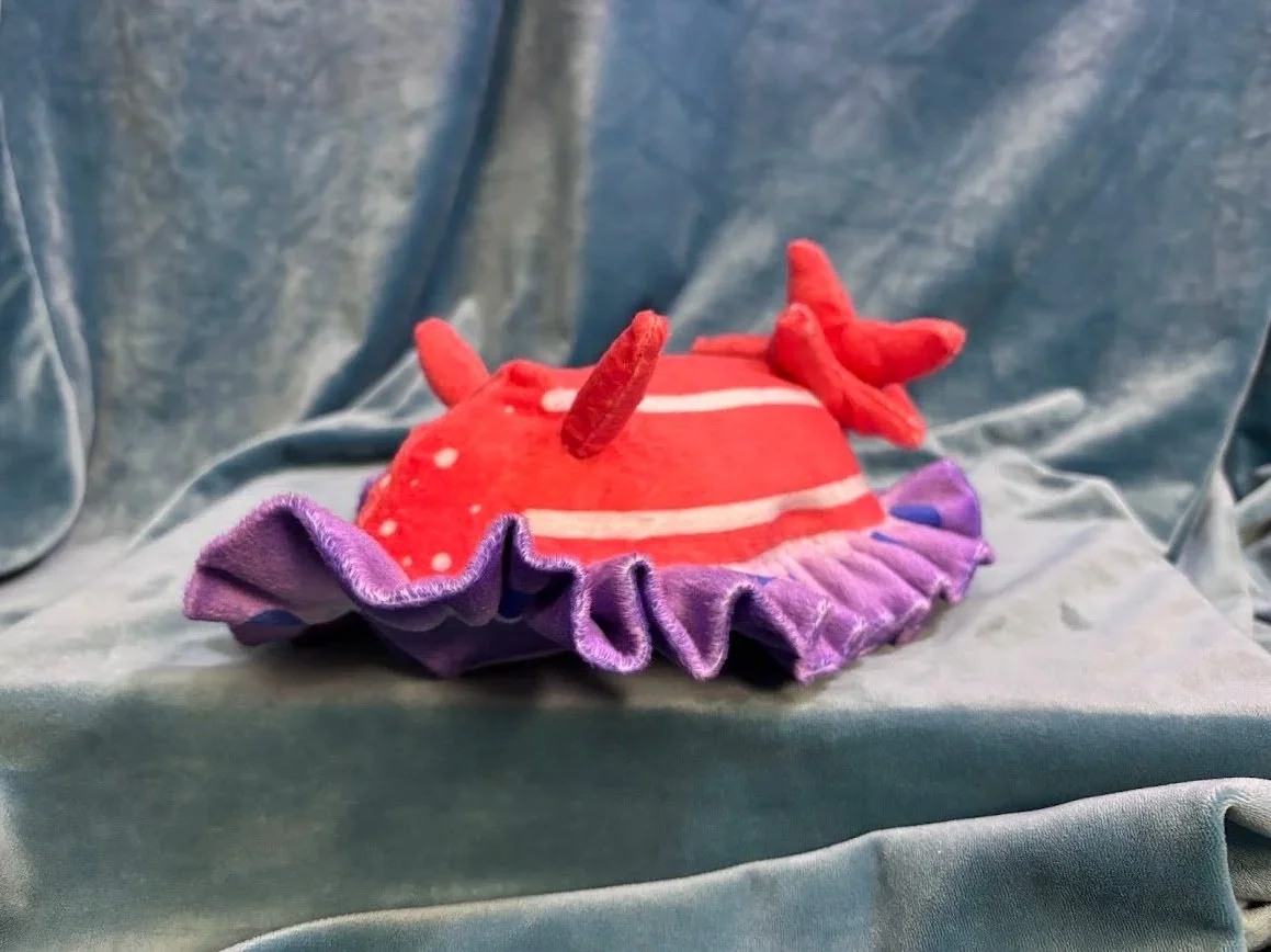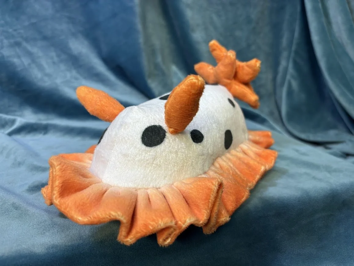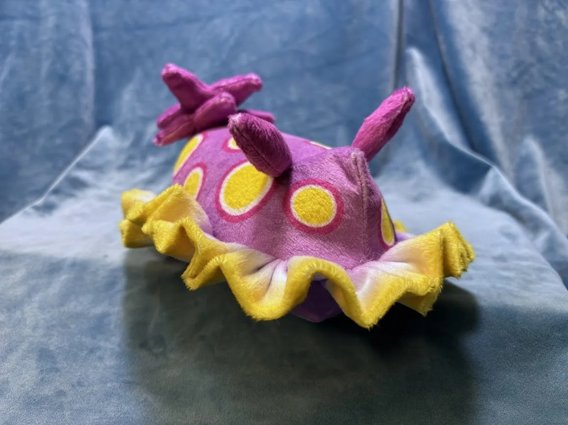 This plush is made with a unique printed pattern to capture the signature colors of the nudibranch. A soft ruffle lines their bodies to mimic their distinct shapes, as well as sewn-on plumes for their nose and gills.