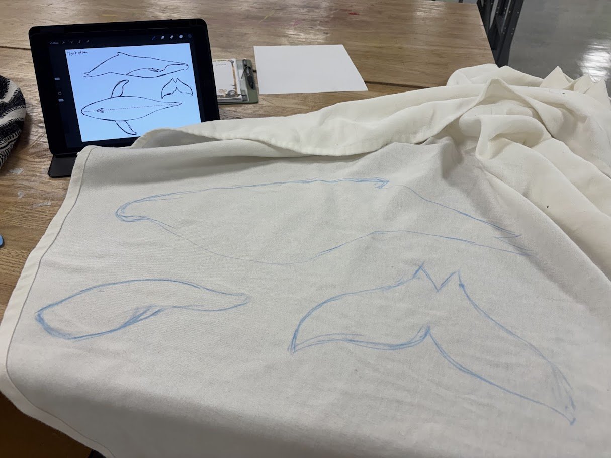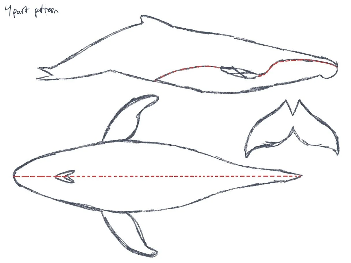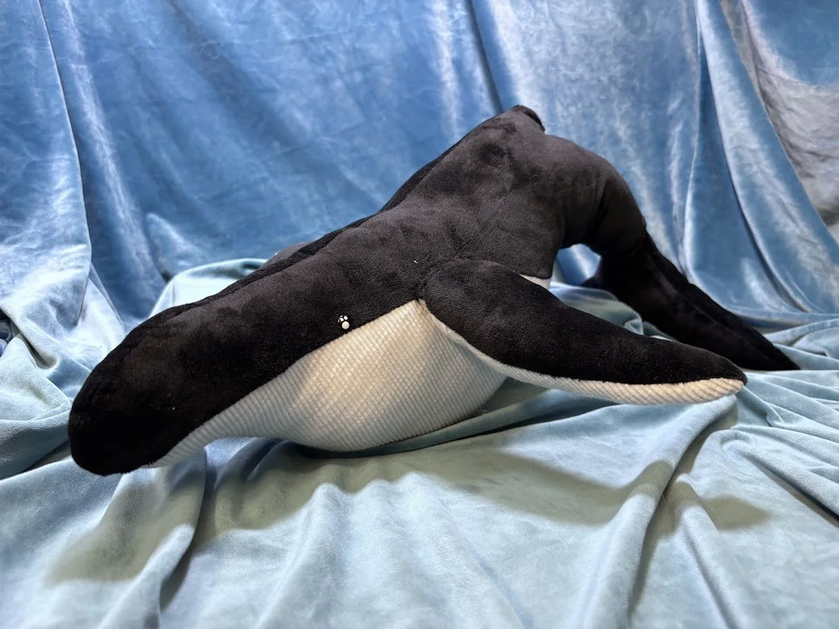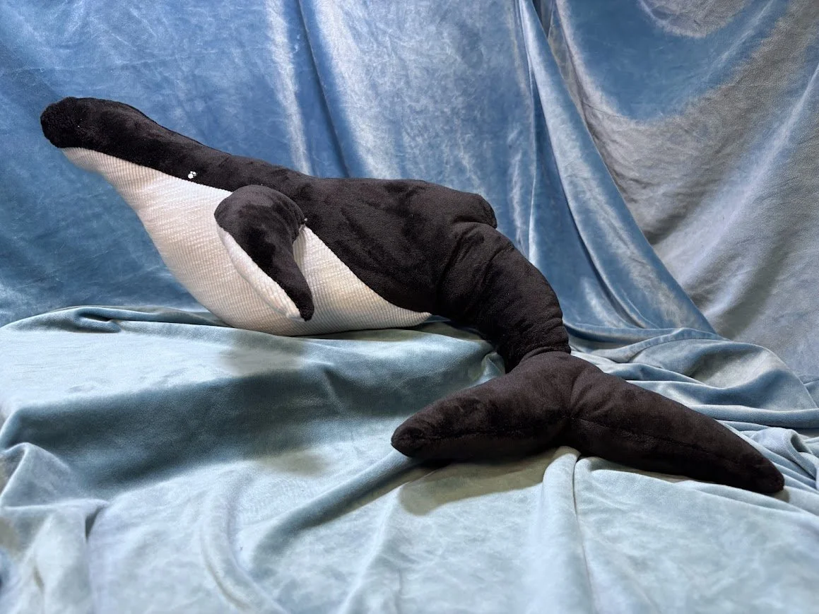This Humpback Whale plush is made with both a soft minky fabric and a ribbed fabric to mirror the whale's belly texture. This plush also has an electronic element wired and sewed into its fin, where if you press a button a speaker in it’s head will start playing whale noises!